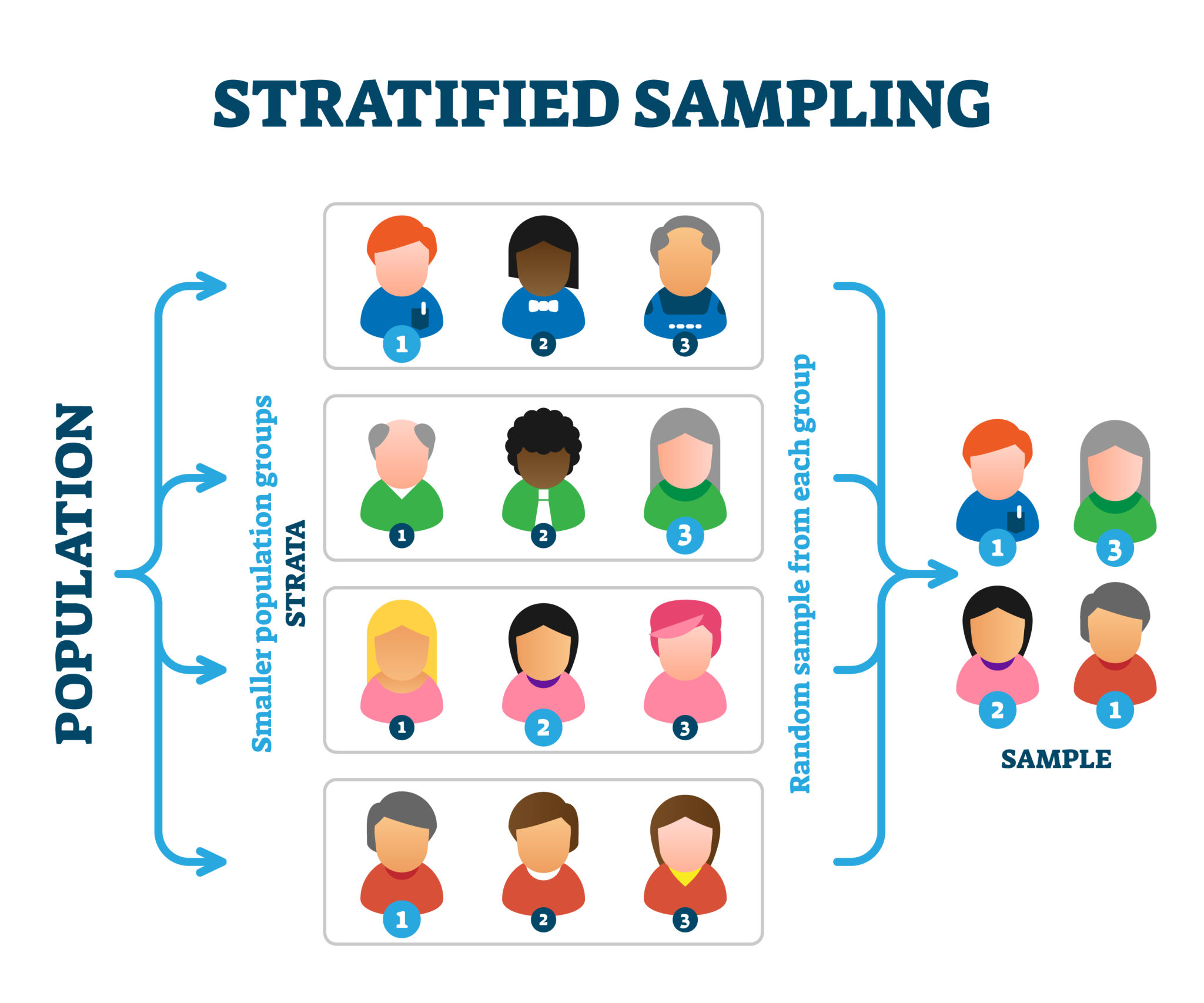 In stratified sampling, the population is first divided into subgroups (called strata) based on shared characteristics such as gender, department, or age. Samples are then drawn proportionally from each subgroup.