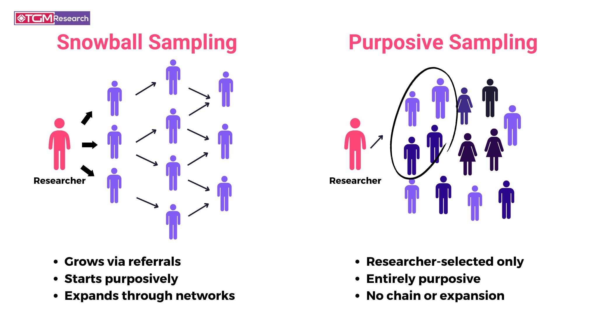 These methods are most suitable for quantitative research, where the goal is to generalise findings to a wider population.